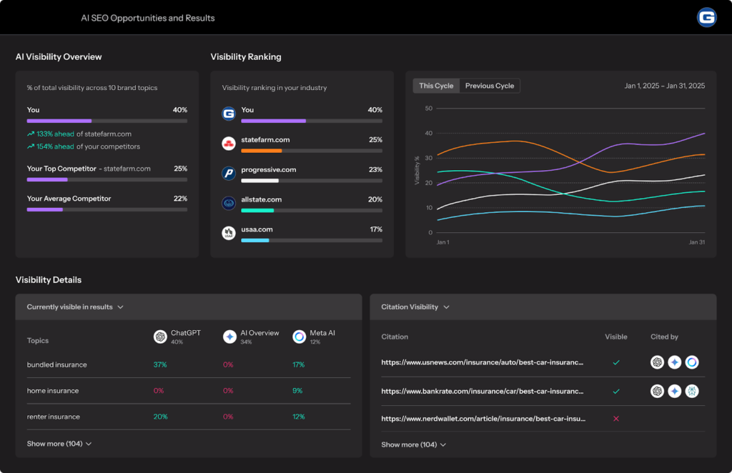 Rankings still matter, but they’re only part of the picture now. To understand visibility in an AI-first search world, teams need dashboards that track what’s happening inside those answer layers.