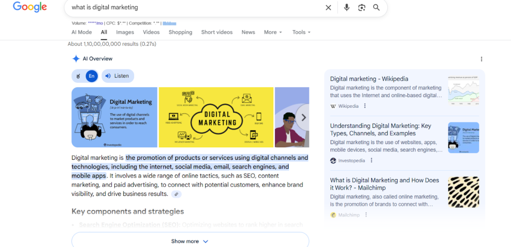 AI search results may look familiar, but the experience underneath is very different from the organic SERPs we’re used to. Instead of a simple list of blue links, you now see conversational responses, short snapshots, and dynamic answers that shift as the AI pulls new pieces of information.