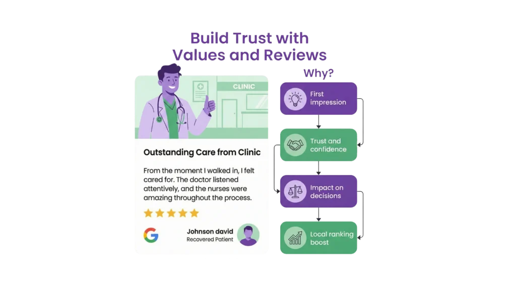 Building authentic trust with potential patients forms the core of effective doctor author profiles SEO. Trust goes beyond credentials or appearance—patients need to see meaningful values and third-party recognition that proves your expertise.