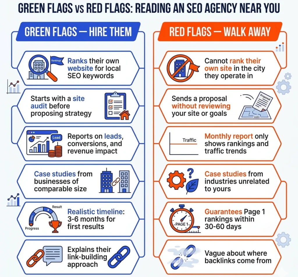 The most reliable signal that an SEO agency near you is operating professionally is that they will not guarantee specific Google rankings. Google’s algorithm is not theirs to control. Agencies that promise page one results within 30 or 60 days are either using tactics that will produce short-term movement followed by a penalty, or they are making promises they cannot keep to close the sale. A realistic agency will give you a clear timeline (3 to 6 months for initial traction, 6 to 12 months for meaningful compounding growth) and explain what drives that timeline based on your specific market and starting point.