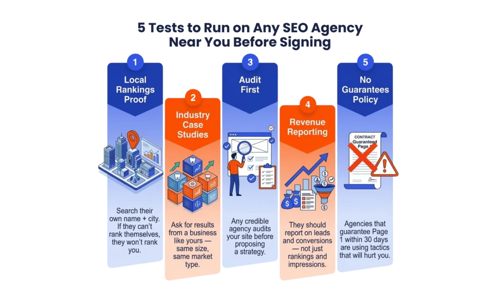 Location is a useful filter, but it comes after capability. Here are the five tests that separate credible local SEO agencies from those that will consume your budget without producing results.