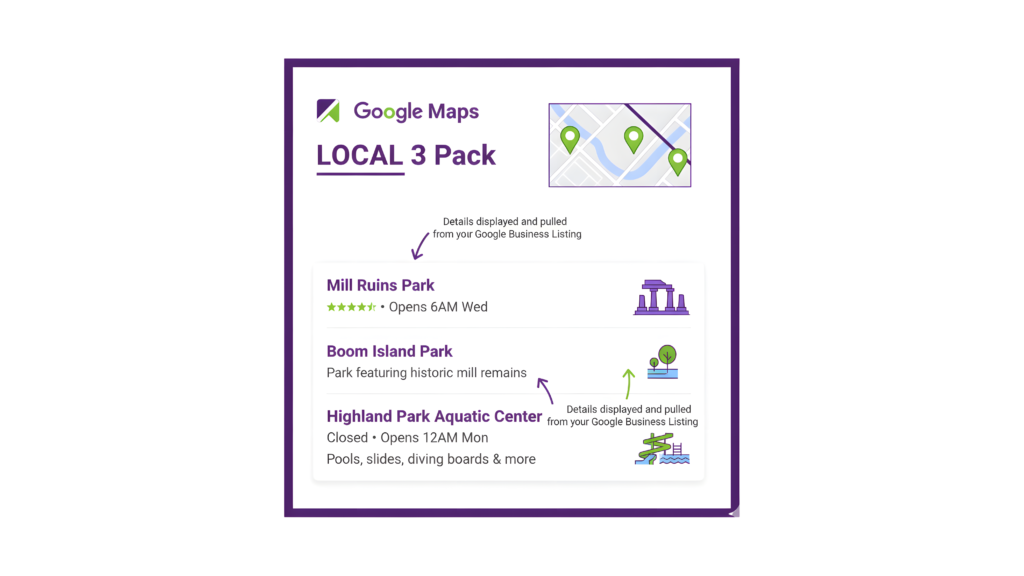 The local map pack (or “3-pack”) shows up when people search with local intent. It displays three businesses matching the search along with their locations on a map. This feature appears above organic results and gives users key business information quickly.