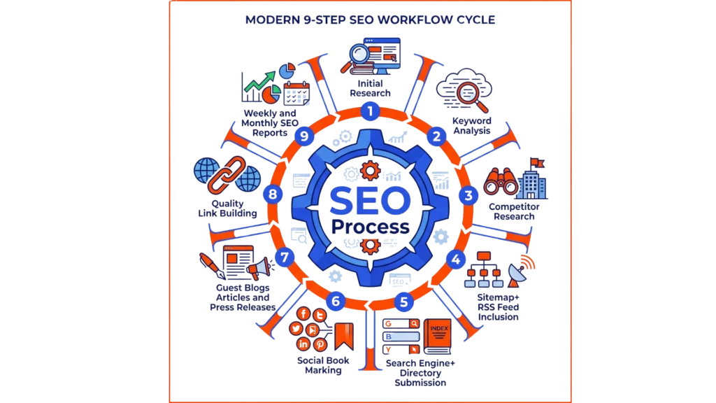 • Technical SEO: site speed, Core Web Vitals, mobile performance, crawlability, schema markup, and indexation