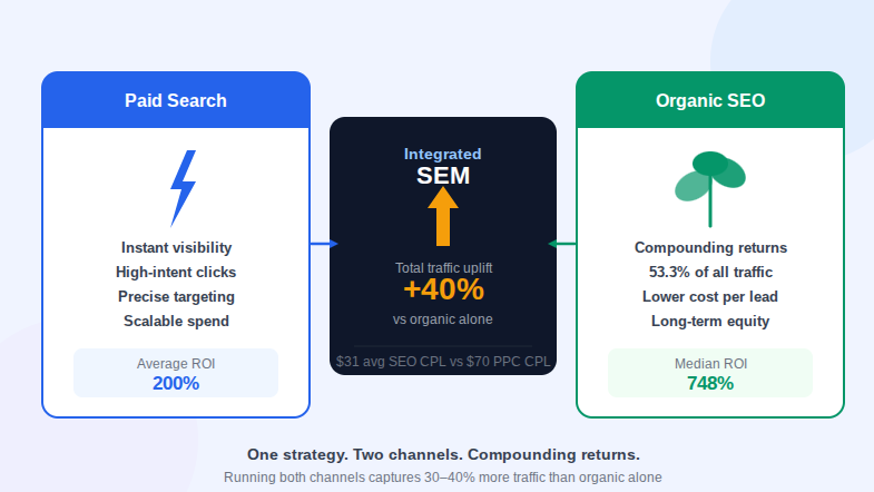 This guide is for marketing directors, growth leads, and business owners evaluating search engine marketing services in 2026. It covers what integrated SEM looks like at a channel level, what the data says about paid versus organic performance, and how the two work together to lower acquisition costs while building lasting search equity.