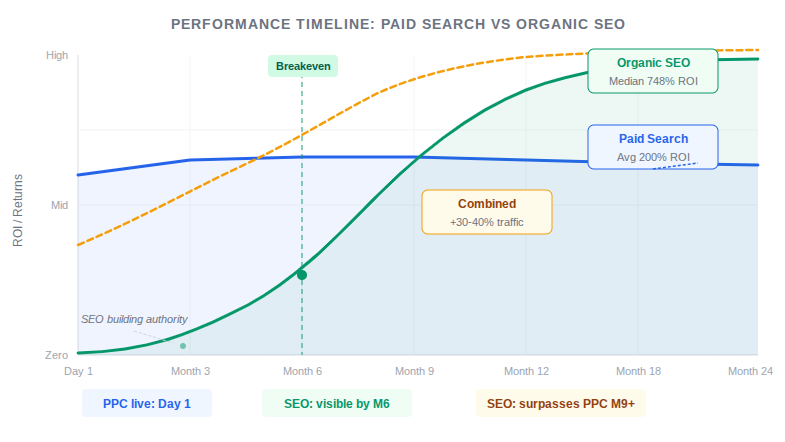 Realistic timelines matter for any integrated SEM engagement. Paid search delivers visibility within days of campaign activation. SEO results typically become measurable within 7 to 9 months, with most B2B SaaS companies reaching SEO investment breakeven at the 7-month mark. Combining both channels from the outset means the business generates measurable search revenue from day one via paid, while the organic channel builds toward a lower-cost-per-lead baseline over the medium term.