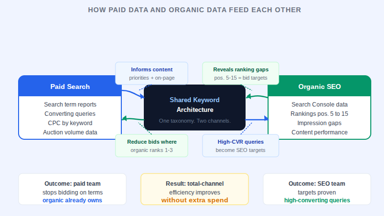 The most significant performance gains in search marketing come not from optimising each channel independently, but from building them around a shared keyword and data architecture.