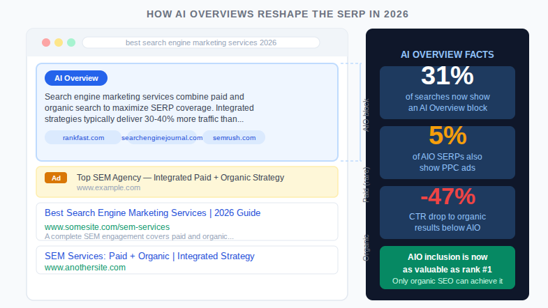 A critical 2026 development: AI Overviews now appear in approximately 31% of search results; only 5% of SERPs featuring AI Overviews also display PPC ads. This means paid search is excluded from a growing portion of commercial query results pages, reinforcing why organic visibility in AI features is no longer optional for brands with a long-term search strategy.