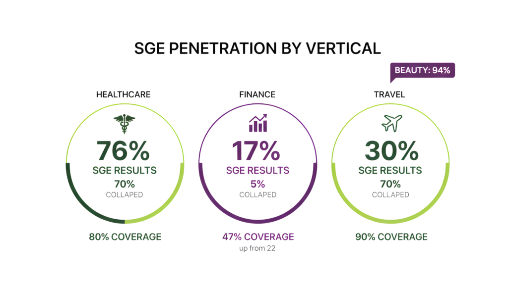 SGE coverage varies dramatically by industry. For example, the healthcare sector sees SGE results for 76% of queries, while the financial sector experiences only 17% coverage. This disparity creates unique challenges and opportunities for businesses in different verticals.
