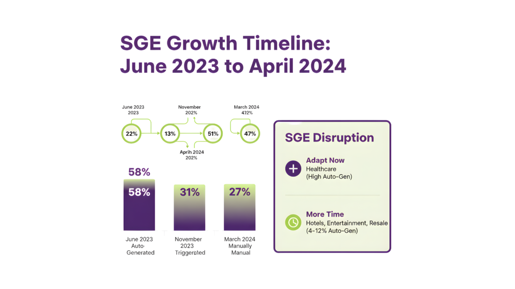 These numbers show a slight decrease in automatic generation. Google seems to be fine-tuning when AI answers work best. Some industries will face SGE disruption earlier than others. Healthcare organizations need to adapt now because of high automatic generation rates. Hotels, entertainment, and real estate businesses have more time to prepare their enterprise SEO strategies since they only see 4-12% automatic SGE generation.
