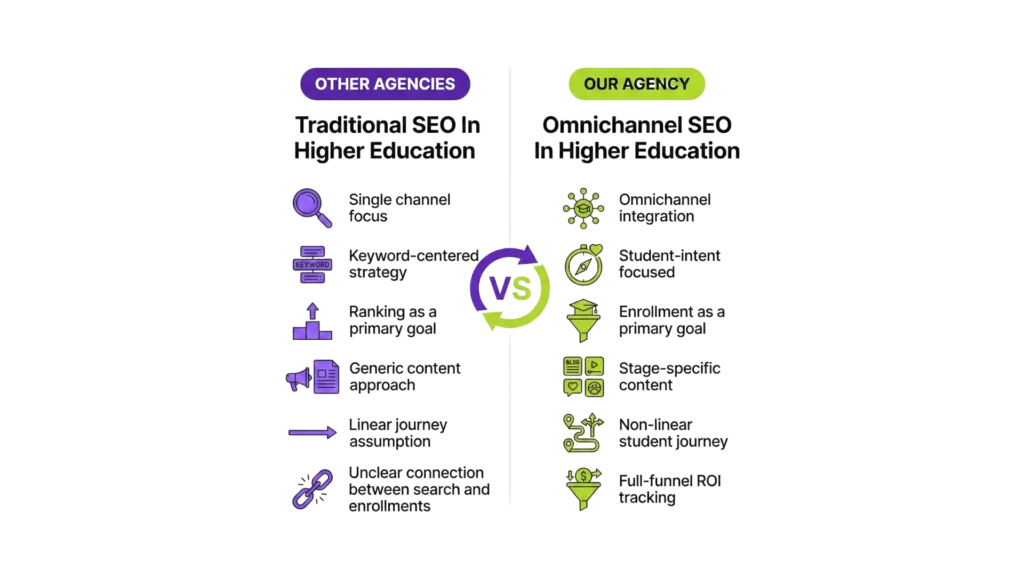 - The Long Enrollment Cycle: In E-commerce, the “sale” happens in 5 minutes. In Higher Ed, it takes 6 to 18 months. Our SEO strategies are built for the “Long Game,” focusing on nurturing leads through the entire funnel.